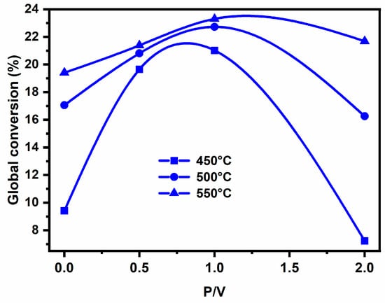 Conversion of propane depending on the reaction temperature and P/V ration in 3.6 wt% V2O5/ZrO2.