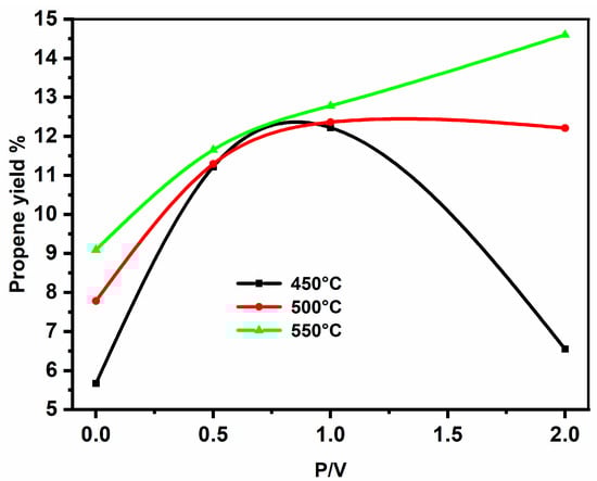 Propane yield depending on the reaction temperature and P/V ration in 3.6 wt% V2O5/ZrO2.
