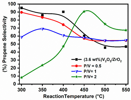 Figure 15 illustrates the variation of propene selectivity of the 3.6 wt%V2O5/ZrO2 modified phosphate versus the reaction temperature and P/V ratio. It is worth noting that for propane ODH, achieving high propene selectivity at high propane conversion is still a challenge, due to the favourable combustion of propene compared to propane ODH [5]. It has been observed that the catalyst prepared at P/V = 1 composition presents a stable average selectivity around 60% regardless of the temperature, while the other materials show a very variable selectivity depending on the temperature and also on the composition, it decreases with increase of phosphate ions and temperature. The catalytic performance as a function of phosphate addition and temperature was evaluated by TOF of propene yield (Figure 16). It found that the catalyst prepared at composition of P/V = 1 in solid 3.6 wt%V2O5/ZrO2 phosphate loaded shows the best performance for all the explored temperatures except for the temperature 550 °C.