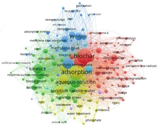In this review, we focused on surface modification and alteration of BC to enhance the efficiency of dye removal from wastewater. A network visualization of terms associated with biochar and dye with a minimum number of 10 occurrences of 3589 associated keywords is represented in Figure 1 (assessed 30 June 2022). It represents the current trends in research related to the application of biochar in association with dye in the Web of Science. Here, the various colors of the nodes represent different clusters, while the size of each bubble depicts its frequency of occurrence. A literature review of BC reports that thermochemical conversion often exhibits low reactivity and selectivity for dye removal [25]. To eliminate these limitations, BC is tailored via numerous techniques to achieve the desired selectivity and reactivity to enhance surface sites and hydrophobicity for regulating the dye removal kinetics [26,27,28]. Factors affecting BC properties and various post-processing modifications, functionalization, and BC activation for dye removal are included. Literature review reports on surface modification of BC for dye removal are very scarce. The application of smart digital technologies such as machine learning and artificial neural networks (ANN) is also covered to further enhance dye removal via BC.