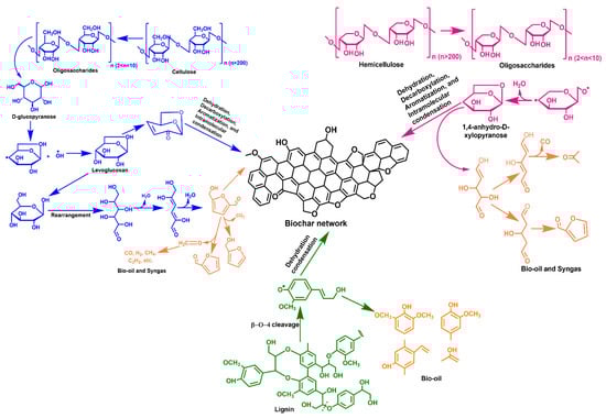 Mechanism of biochar formation from cellulose, hemicellulose, and lignin.