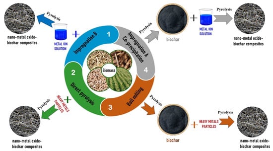 - Zhao, C.; Wang, B.; Theng, B.K.; Wu, P.; Liu, F.; Wang, S.; Zhang, X. Formation and mechanisms of nano-metal oxide-biochar composites for pollutants removal: A review. Sci. Total Environ. 2021, 767, 145305. [Google Scholar] [CrossRef]