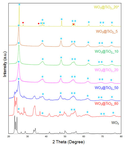 Based on its XRD pattern, WO3@TiO2_20* exhibits higher crystallinity degree if compared to the others and the appearance of new diffraction peaks can be observed.