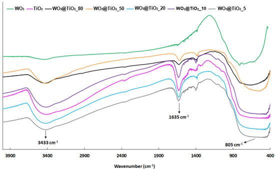 The FT-IR spectrum of WO3 exhibits characteristic vibration bands, such as those at approximately 3433 cm−1 and 1635 cm−1, that can be associated with the symmetric stretching vibrations of WO3 and intercalated water molecules and the deformation vibrations of H–O–H bonds of the adsorbed water molecules, respectively, and the signal at 805 cm−1, attributed to O–W–O stretching modes of WO3 [39].