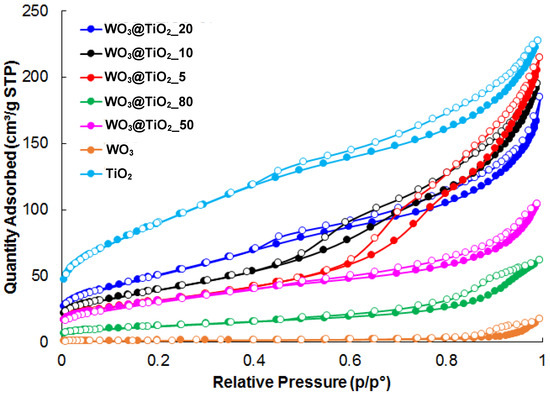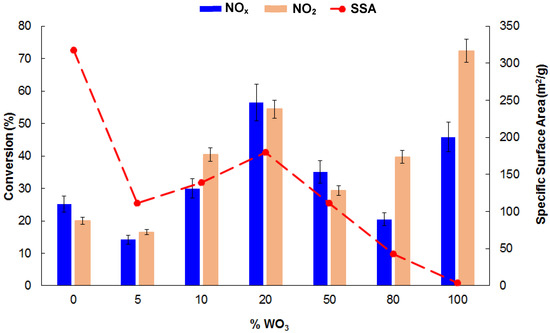Finally, the effect related to the different surface area values cannot be ignored. As for the photocatalytic activity, the surface area values also seem to be correlated to the WO3 load and the most active catalyst (WO3@TiO2_20) is also the one with the highest surface area (Figure 8, Table 1). At first glance, the results obtained by the WO3@TiO2_20 photocatalyst seem to contrast with those of Mendoza et al. [22], who report very high NO conversion values under visible light irradiation in similar conditions. The different photocatalytic activity of the WO3@TiO2_20 sample compared to those reported by Mendoza and coworkers can be reasonably attributed to the real WO3 content in the synthesized composites that it is not specified in the work of the author [22].