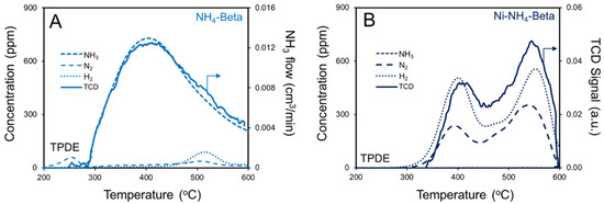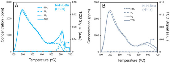 TPDE spectra. (A) NH4-Beta and (B) Ni-NH4-Beta after in situ pretreatment at 300 °C.