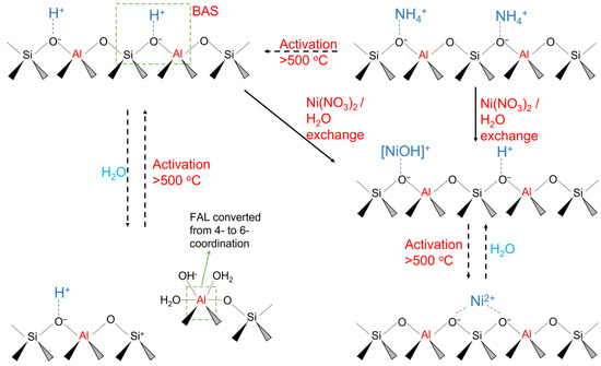 For catalysts prepared from H-Beta, Ni loading increased approximately twofold between the first and second exchanges; however, subsequent exchanges did not result in significant loading increases. The Ni loadings are ~2 wt.% after two to four exchanges. The maximum loading (observed for Ni-H-Beta (H+-3x)) corresponded to ~88% exchange. Partial hydrolysis of FAl sites in aqueous media provides a plausible explanation for the lower maximum loading of catalysts prepared from H-Beta. FAl species in hydrogen zeolites (especially those in proximal pairs) are converted via Si-O-Al bond hydrolysis from tetrahedral to octahedral coordination when exposed to aqueous media (see scheme in Figure 2) [22,23,24]. Conversely, if the charge-compensating cation is Na+ or NH4+, FAl species are stable in aqueous media [22]. For zeolite Beta, it has been observed that one of the two crystallographically distinct T-sites occupied by Al3+ is selectively hydrolyzed to form an octahedral cation [25]. The Al3+ ion is coordinated by 2 H2O molecules, 3 framework oxygens, and a OH− group which contains the H+ that originally occupied the exchange position [26]. Thus, this proton is no longer available for ion exchange with Ni2+, thereby reducing the overall exchange capacity. The resultant octahedral Al3+ species is termed “framework associated”; this process is reported to be fully reversible upon dehydration at high temperatures (e.g., 500 °C). For Beta with Si/Al = 12.5, up to 25% of such sites may be hydrolyzed [24]. Because the Ni loading is approximately 20% lower in the case of H-Beta exchange, we infer that pairs of Al-containing T-sites are hydrolyzed; otherwise, the drop in Ni uptake would be greater.
