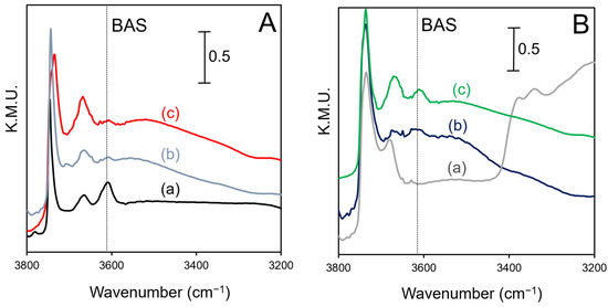 The DRIFT spectrum (Figure 4A) of H-Beta in the O-H stretching (vOH) region contains a band at 3607 cm−1, which is characteristic of bridging Si-OH-Al moieties (isolated BAS); the bands at 3746 and 3665 cm−1 are assigned to external silanol groups and EFAl species, respectively [35]. Internal silanol groups (3732 cm−1), although present after calcination of H-Beta at 500 °C, are effectively eliminated by calcination at 600 °C (see Figure S4). Internal silanol groups are associated with structural defects, such as Al3+ vacancies resulting from dealumination or stacking faults in the Beta structure [35,36]. EFAl species comprise Al3+ ions that have been completely and irreversibly removed from the framework, and a number of coordination environments (including 3 OH− groups and 3 H2O molecules) have been proposed [37,38]. EFAl properties are dependent on the parent zeolite and method of dealumination [37,39], and some researchers have inferred that EFAl species exhibit Lewis acidity [40]. In addition, a very high frequency (VHF) band at 3782 cm−1 is observed. Typically, this band is attributed to tri-coordinated-framework-associated Al species (SiO-Al(OH)-OSi) which form via bridging Si-(OH)-Al groups upon calcination [41].