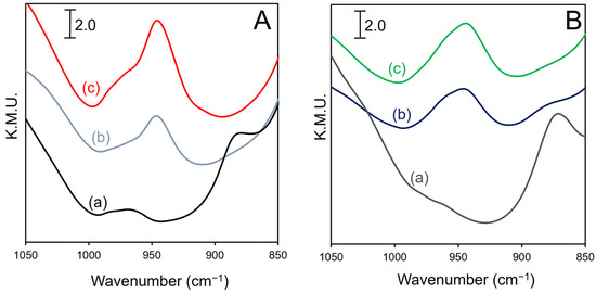 DRIFT spectra of H-Beta, NH4-Beta, and the Ni-H-Beta catalysts in the T-O-T “transmission window” (900–1000 cm−1) are shown in Figure 5. Small features between 950 and 1000 cm−1 are observed for the parent zeolites that likely arise from transition metal ion impurities. New peaks are observed for the Ni-H-Beta catalysts that evidence strong interaction of Ni2+ ions with the zeolite framework. Previously, similar evidence for interaction of “bare” (coordinated to only framework oxygens) Co2+ ions within zeolite Beta has been reported by Dedecek et al. [45]. These peaks arise from antisymmetric T-O-T skeletal vibrations that are perturbed (red-shifted) by the presence of bare Me2+ ions in exchange positions. Closely similar spectra have been reported for Co-Beta, Cu-SSZ-13, and Ni-FER catalysts and correlated with Me2+ ions occupying distinct ion-exchange sites that are populated sequentially with increasing metal loading [45,46]. For our Ni-H-Beta catalysts, a primary band at 945 cm−1 with a shoulder (or side band) at 970 cm−1 is observed. The intensity of these bands increases in proportion to Ni loading, as can be seen by comparing the Ni-H-Beta (H+-1x) and Ni-H-Beta (H+-4x) spectra (Figure 5A). The 945 cm−1 band is dominant for catalysts prepared from H-Beta irrespective of Ni loading. The 970 cm−1 band is more prominent in catalysts prepared from NH4-Beta (Figure 5B); however, these catalysts also have higher Ni loadings. The T-O-T spectra strongly suggests that Ni2+ ions are located in two distinct exchange positions in zeolite Beta. The T-O-T frequencies, however, are 10–30 cm−1 higher than might be expected from previous reports on related Ni-zeolite catalysts, suggesting somewhat weaker interactions with framework oxygens.