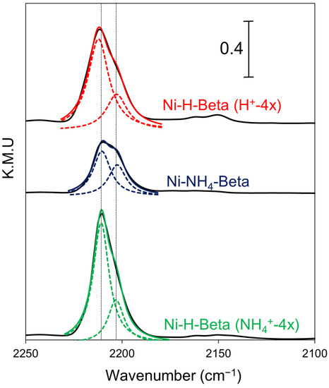The Lewis acidity of Me2+ ions in zeolites depends on the number of framework oxygens to which the ion is coordinated [27,47,50]. Thus, Ni2+ species with lower oxygen coordination numbers are expected to exhibit greater Lewis acidity, and Ni2+ ions occupying different ion-exchange sites in the Beta structure should display different CO-stretching frequencies. According to Dedecek et al., Me2+ ions in the γ-exchange site balance FAl present in opposite six-membered rings of the Beta hexagonal prisms in polymorphs A and B and are coordinated to six framework oxygens in a pseudo-octahedral geometry [45]. Alternatively, Me2+ ions in the β-exchange site charge-balance the FAl pairs present in six-membered rings in the main channels of polymorphs A and B. The coordination geometry of Me2+ ions in the β site in trigonal planar; therefore, β-type Ni2+ ions should be more electrophilic than ions in the γ site and adsorbed CO should exhibit a higher stretching frequency. The α-exchange site consists of an elongated six-member ring resulting in fourfold coordination of an Me2+ ion that sits above the plane in a square pyramidal arrangement; however, this site only exists in polymorph C of zeolite Beta and is located within the hexagonal cages (prisms). If accessible, Ni2+ ions located in the α site of polymorph C should be of intermediate Lewis acidity. Commercial zeolite Beta typically comprises intergrowths of polymorphs A and B (in nearly equal proportions) with negligible polymorph C [36]. Thus, we assign the 2211 cm−1 vCO band to isolated Ni2+ ions in the β exchange positions and the 2203 cm−1 band to Ni2+ ions in γ positions. There should be equal numbers of each type of site available; however, Ni2+ ions in the γ position may be less able to coordinate CO owing to their lower accessibility.