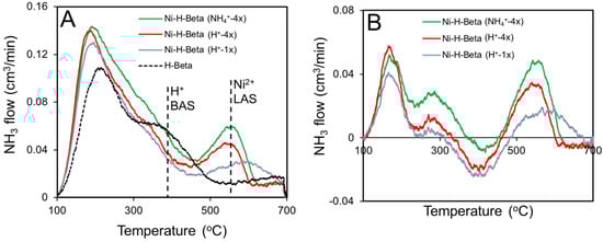 (A) NH3 TPD spectra of H-Beta and Ni-H-Beta catalysts after in situ pretreatment at 500 °C and (B) TPD difference spectra (subtracting H-Beta reference).
