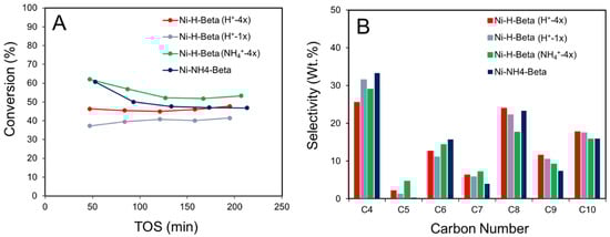 The Ni-H-Beta catalysts exhibited only ~30% selectivity to butenes and high selectivity to C6-C10 oligomers, thus deviating markedly from a Schulz–Flory distribution (Figure 10B). Moreover, selectivity to octenes (~20%) was higher than hexenes (~15%) selectivity. These deviations from a Schulz–Flory distribution can be attributed co-oligomerization involving BAS that dimerize butenes to octenes and also crack even-numbered oligomers to odd-numbered products [55,56]. The Ni-H-Beta (NH4+-4x) catalyst exhibited slightly lower C8+ oligomer selectivity compared with Ni-H-Beta (H+-4x). We suggest this to be the result of a higher BAS/Ni2+ ratio in the case of the latter. Selectivity to cis- and trans-C4 remains almost constant once the reaction reaches steady state, but i-C4 selectivity (a marker of BAS activity) declines to almost zero after <1 h (see Figure S7). This result suggests that the double-bond isomerization of 1-butene to cis- and trans-butene is performed primarily by Ni2+ sites. Others have claimed double-bond isomerization to be indicative of BAS activity [8,57], but this pathway has recently been reported in BAS-free Ni-Beta catalysts by Joshi et al. [17].