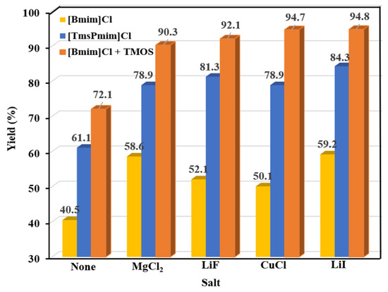 To simplify the catalytic system, a siloxyl-functionalized ionic liquid, namely, 1-(3-trimethoxysilylpropyl)-3-methyl imidazolium chloride ([TmsPmim]Cl) was used to replace the TMOS and [Bmim]Cl for the Ru-catalyzed methoxycarbonylation of CH2=CH2 with CO2 as carbonylation reagent. Happily, the MPA yield increased considerably from 40.5% to 61.1% under otherwise identical conditions (Table 1, entries 5 and 6). Such a phenomenon can be attributed to the fact that the siloxyl-functionalized [TmsPmim]Cl plays two roles, in participating in the formation of real active Ru species and in removing H2O via reaction with the Si-OCH3 group of [TmsPmim]Cl. It should be emphasized that the catalytic system with [TmsPmim]Cl showed slightly lower activity than that with binary [Bmim]Cl and TMOS system (Table 1, entries 6 and 7). In this tasked ionic liquid-based catalytic system, the metal halides also demonstrate a promotion activity as in the ternary catalytic system comprising Ru, [Bmim], and TMOS. Again, the addition of LiI resulted in the highest activity, producing 84.3% MPA (Figure 1).