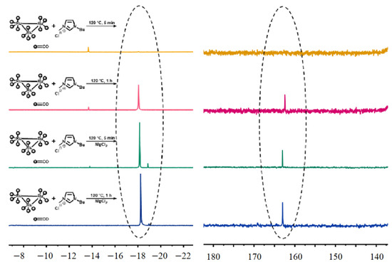 Ru-hydride-carbonyl-carbene complexes have been regarded as possible catalytic active species in the hydroformylation of alkenes using CO2 as the carbonyl source [15,33,34]. To explore the possible formation of such species, the reaction mixture of Ru3(CO)12 and [Bmim]Cl in the absence or presence of MgCl2 additive was investigated by NMR spectroscopy in light of reports (Figure 2) [15]. In the absence of MgCl2 additive, it was observed by 13C NMR spectra that the intensity of the signal at 163 ppm, assigned to N-heterocyclic carbene (NHC), enhanced gradually. Furthermore, the intensity peak at about −18 ppm, which is assignable to ruthenium hydride, showed a similar trend with prolonging reaction time. These results suggested the formation of Ru-hydride-carbonyl-carbene complex, face-capped trinuclear [Ru3(μ-H)23-MeImCH)(CO)9] (I) [15,33]. The isolated I displayed a slightly higher activity than pristine Ru3(CO)12 in the methoxycarbonylation of ethylene with CO2 under identical conditions (entry 1 vs. entry 2, Table 2). This observation supports I as a possible active species generated in situ from the combination of Ru3(CO)12 with the [Bmim]Cl catalytic system. The easier formation of active species I in the presence of MgCl2 is responsible for the promoting effect because metal halide salt can interact with Cl anion of imidazolium ionic liquids. The C2-H bond can be weakened by the addition of inorganic salts and then 2-H is easy to disengage from the 1-alkyl-3-methylimidazolium-based IL [35,36]. This facilitates the formation of I carbene species. This speculation is further supported by the fact that the intensity of signals characteristic of Ru-NHC and Ru-H in the presence of MgCl2 at 5 min are comparable to those without MgCl2 for 60 min (Figure 2). The interactions varied with the kind of metal salt additive, which accounts for the observation of the dependence of yield (or activity) on the metal salt employed. It is the best evidence that the adduct of BmimMgCl3 derived from MgCl2 and [Bmim]Cl demonstrated a similar promoting effect to the binary MgCl2 and [Bmim]Cl in the Ru-catalyzed hydroesterification reaction (entry 6 vs. entry 7, Table 2).