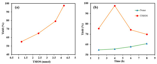 To further maximize formation of MPA, the influence of catalyst loading, reaction temperature, CO2 pressure, and reaction time was investigated in the presence of TMOS. As noted in Table 3, the higher temperature is favorable for the reaction. As the temperature varied from 160 °C to 200 °C, the yield increased from 27.1% to 97.5% (entries 1–3, Table 3). Furthermore, pressure plays a critical role in the catalytic activity. As indicated by entries 4 and 5 in Table 3, the yield increased significantly from 50.5% to 90.0% with increasing pressure from 2.0 MPa to 3.0 MPa. However, the productivity was promoted slightly as the CO2 pressure was further raised up to 4.0 MPa. One possible explanation for the increase of yield at higher pressure is due to the increased solubility of CO2 in the ILs [37,38], which leads to a higher CO2 concentration in the medium, which is beneficial to the methoxycarbonylation reaction. The limited solubility of CO2 in the ILs could account for the slight improvement in the reaction rate above a certain pressure (herein, 3.0 MPa). Although reducing catalyst loading from 0.042 mmol to 0.010 mmol decreases monomer conversion, the catalytic activity is still acceptable, with a yield of more than 70% in 4 h. Figure 3a shows the dependence of yields on the concentration of TMOS. The yield increases significantly with the increase of TMOS.