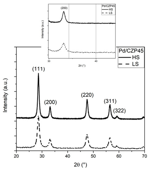 Diffractograms of Pd-HS and Pd-LS confirm the fluorite structure (SG: Fm-3m) of the two CZP45 supports (Figure 1). No characteristic peak of PdO (JCPDS data (41-1107) [29] or metallic Pd (JPCDS 05-0681) [26] has been detected due to the extremely low Pd loading and a good Pd dispersion. The SSA of Pd-HS is more than 3 times larger than that of Pd-LS (Table 1), in agreement with SSAs of Pd-free supports [28]. The crystal size of Pd-HS, estimated from the Scherrer’s equation on the more intense diffraction peak (111), is only slightly lower than that of Pd-LS. This indicates that the highest SSA of Pd-HS can be mainly attributed to a larger intergranular porosity in line with porous volumes (Table 1).