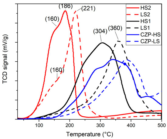 Figure 3 shows H2-TPR profiles of Pd-HS and Pd-LS. The two successive TPR experiments are denoted HS1/HS2 and LS1/LS2. The second TPR was run after a redox sequence at 500 °C (1 h in 5 vol%H2/He and 1 h of re-oxidation in 5 vol%O2/He) as described in the experimental part. The overall H2 consumption during LS1 and HS1 far exceeds the theoretical reduction of PdO into Pd (16 µmol/g for LS1 and 13.1 µmol/g for HS1), reaching a similar value for both catalysts (Table 2). Their TPR profiles display a non-symmetrical H2 consumption peak centered at 304 °C and 360 °C, for Pd-HS and Pd-LS, respectively. The reduction of both catalysts starts from around 90 °C and then slowly and gradually grows up to 170 °C on Pd-HS and 250 °C on Pd-LS. According to the literature, the reduction of bulk PdO NPs supported on ceria generally takes place below 100 °C, depending on their size [23,25,30], while small PdOx clusters in close interaction with the support or Pd2+ incorporated into ceria such as in Pd-O-Ce bonds [31] are reduced at higher temperatures. Therefore, the two catalysts after the initial calcination step seem to predominantly contain very small PdOx species strongly interacting with CZP45. Furthermore, the reduction of Pd-LS and Pd-HS starts at a higher temperature than that of Pd/CeO2 catalyst, in which Pd2+ cations were incorporated in the fluorite structure [31], suggesting that Pd is mainly dispersed as isolated Pd2+ cations on CZP45. The slow initial growth of the reduction at low temperature could correspond to the formation of small Pd clusters by the cleavage of Pd-O-Ce bonds, a prerequisite to trigger the support reduction via the H2 spillover. A highest SSA promotes the H2 spillover, explaining the shift to low temperatures of the main reduction peak of Pd-HS compared to Pd-LS. We also notice that the addition of Pd on CPZ45 shifts TPR curves to lower temperatures, confirming the key role of Pd, even at very low loading, in the H2 chemisorption.