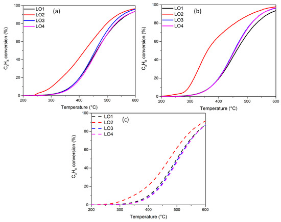 Variation of the propane conversion as a function of the temperature (a) for Pd-HS (reduction step in H2), (b) for Pd-HS (reduction step in CO), (c) for Pd-LS (reduction step in H2). Reaction mixture: C3H8/O2: 2000 ppm/9 vol%.