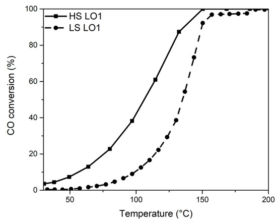 CO conversion for Pd/CZP45-LS and Pd/CZP45-HS. Reaction mixture: CO/O2: 1910 ppm/9 vol%.
