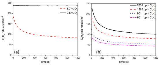 Variation of propane conversion as a function of time for Pd/CZP45-LS at 400 °C (a) for two different oxygen concentrations using 1985 ± 9 ppm of C3H8 and (b) for different C3H8 concentrations using 8.7% ± 0.44% of O2.