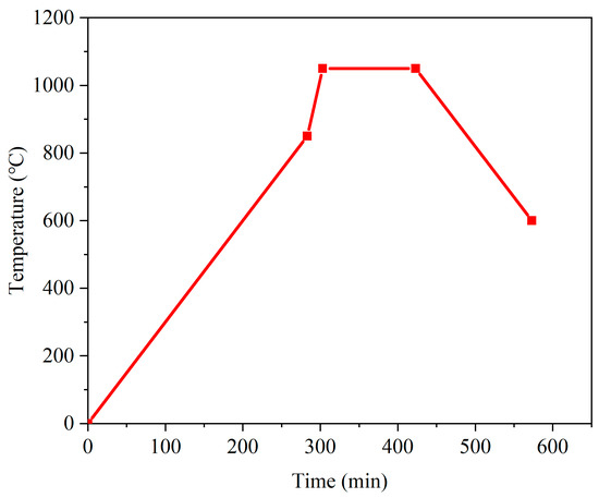 The detailed sintering temperature profile is shown in Figure 1. The rate of temperature increase is 3 °C/min from the ambient temperature to 850 °C. When the temperature is above 850 °C, the temperature increase rate is set to 10 °C/min. The temperature decrease rate is 3 °C/min until the temperature drops below 600 °C, at which point the furnace is powered off and naturally cooled to ambient temperature. The main equipment used in this experiment is listed in Table 1.