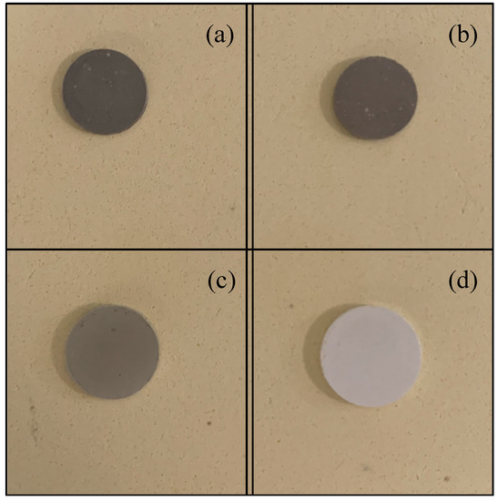 Photos of four sintered electrolytes with different contents of sintering aid: (a) No. 1, 0.076 g; (b) No. 2, 0.020 g; (c) No. 3, 0.010 g; (d) No. 4, 0 g.