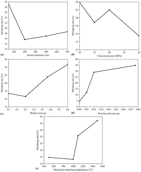 Effects of sintering parameters on the shrinking rate of GDC electrolyte: (a) particle diameter; (b) uniaxial pressure; (c) binder mass; (d) sintering aid mass; (e) maximum sintering temperature.