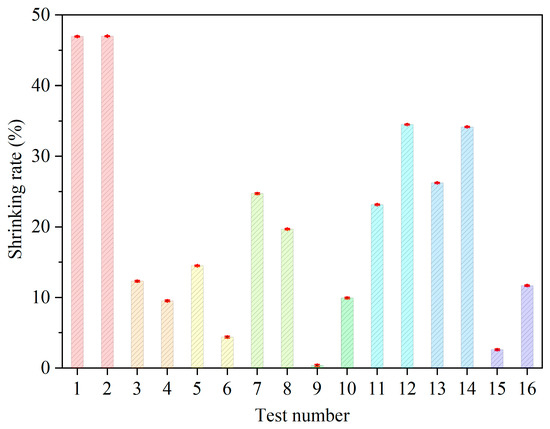 The shrinking rate is the function of the measured values of the diameter and thickness of the pellet before and after sintering. Assuming the uncertainty of the measured diameter is 0.2 mm and the thickness is 0.1 mm, the uncertainties of the 16 groups of the shrinking rate are determined according to Equation (12). The results are shown in Figure 5. The uncertainties of the shrinking rate are very low for most of the groups. The average uncertainty of the shrinking rate is 0.0925%. The maximum uncertainty is 0.1169% for test No. 9, with a shrinking rate of 0.3730%. The uncertainties of test Nos. 4, 6, 10, and 15 are also relatively high. The minimum uncertainty is 0.0545% for test No.2. The uncertainties of test Nos. 1, 12, and 14 are also low. Generally, the measured shrinking rates have a high precision, with acceptable uncertainties.