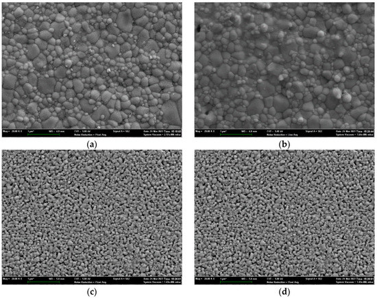 Figure 4 shows shrinking rate according to the orthogonal method. Figure 4a shows that the shrinking rate is the highest when the particle size is 150 nm. As the particle size increases, the shrinking rate generally decreases due to a low packing density. Figure 4b shows the impact of the uniaxial pressure of the infrared tablet press. As the uniaxial pressure increases, the shrinking rate declines due to an improvement of the initial packing density. In practice, an isostatic press with pressure of more than 300 MPa can be used to provide an even higher initial packing density. Figure 4c shows the effect of the binder content. As the binder mass increases, the initial packing density of the pellets decreases because the porosity of the slurry in the subsequent degumming process is increased, leading to a higher shrinking rate during the subsequent sintering process. Therefore, maintaining a low level of binder content aids in the densification of the powder. Figure 4d shows the effect of different masses of sintering aid. It is evident that the addition of CuO sintering aid can enhance the shrinking rate. When the sintering aid content is less than 0.02 g, increasing the mass fraction of the sintering aid can increase the shrinking rate rapidly. However, when the mass of the sintering aid increases further, its effect on the shrinking rate is reduced, also increasing the risk of high electric conductivity. Therefore, the mass of the sintering aid should be set to a suitable range. The effect of the maximum sintering temperature is shown in Figure 4e. When the maximum sintering temperature is less than 1000 °C, a shrinking rate of less than 16% is obtained, resulting in low sintering kinetics. When the maximum sintering temperature is increased beyond 1000 °C, the shrinking rate increases significantly, reaching a maximum of 1050 °C. The results indicate that the shrinking rate is sensitive when the temperature is between 1000–1050 °C. Constrained by the rigid requirement of the metal substrate, the maximum sintering temperature cannot be increased further. In practice, the maximum sintering temperature should be maintained around 1050 °C to obtain a high level of densification.