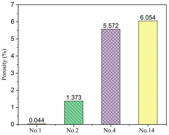 To validate the densification of the sintered pellets, the surface microstructures are measured by SEM. The SEM images Nos. 1, 2, 4, and 14 are shown in Figure 6 with a magnification of 50 K. Good densification is achieved for the No. 1 sample. The boundaries of the grains are visible, and most of the grains have a diameter of less than 1 um. If the grain size is too small, the resistance of ionic conductivity increases along the grain boundaries. However, an annealing treatment can be adopted to obtain a larger grain size. For the No. 2 sample, several small holes can be observed on the surface, although it also highly densified. In contrast, the densification of the 14 other samples is poor. The surfaces of Nos. 4 and 14 samples are porous. Many small particles are aggerated, and sintering necks connect adjacent particles. However, such a high porosity makes it difficult to fulfill the requirement of densification of more than 95%. Figure 7 shows the porosity calculated by ImageJ software, indicating a high consistency with that obtained by range analysis. The samples with a higher content of sintering aid are prone to densification. The mass fractions of the sintering aid for the Nos. 1 and 2 samples are 8.29% and 2.14%, respectively. Generally, a mass fraction of more than 3% increases the risk of high electric conductivity. Therefore, the mass fraction of the sintering aid should be controlled at a suitable level.