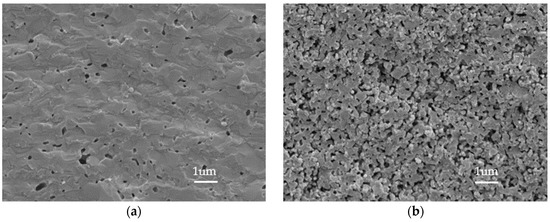 Figure 8 shows SEM images of the cross sections of Nos. 1 and 11 with a magnification of 100 K. It is evident that there is no direct connection path between the two sides of sample No. 1, although many small voids exist. Therefore, gas tightness is guaranteed. In comparison, sample No. 11 exhibits high porosity. A gas seal between the anode and the cathode cannot be realized, and the cross-talk phenomenon will be serious.