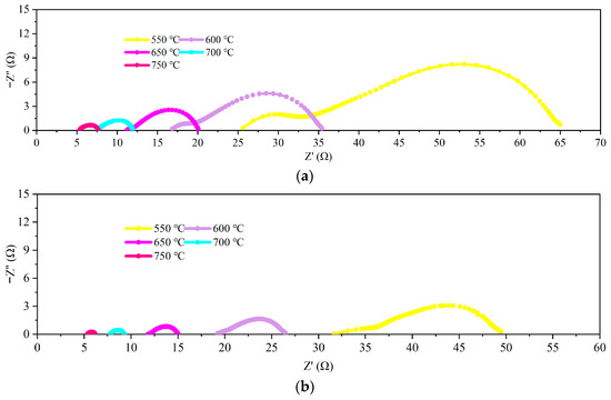 EIS plots of the GDC pellets measured at different temperatures: (a) No. 1; (b) No. 2.