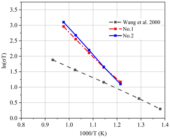 The conductivity of the sintered GDC electrolyte is measured in air using an electrochemical workstation. GDC exhibits a mixed ionic–electric conducting characteristic [50]. Therefore, the measured conductivity is the summation of the oxygen ions and electrons, as well as holes. The overall conductivity of the No. 1 and 2 samples are tested. EIS data are plotted in Figure 9. The variation trends of the AC impedance curves are similar between the two samples at different temperatures. In each EIS profile, the left side is associated with the ohmic resistance of the electrolyte, whereas the right side indicates the electrolyte–electrode interface resistance [45]. The left intersection point of the impedance curve with the X-axis is the ohmic resistance of the electrolyte, and these values are determined for each profile. The ohmic resistances of the two samples increase as the temperature decreases. The resistance of sample No. 2 is slightly higher than that of No. 1. When the temperature is 650 °C, the resistance of sample No. 1 is 11.23 Ω, whereas that of sample No. 2 is 11.80 Ω. Figure 10 shows the overall conductivity profiles of sample Nos. 1 and 2. The measured overall conductivity of GDC is also plotted in [51]. The measured conductivity is greater than that reported in [51], and working temperature is especially high. Nevertheless, this comparison is preliminary because many of the parameters are not the same as those in [51]. The conductivity of the GDC electrolyte is affected by the particle size, sintering process, and impurity content [20,52,53]. For instance, the samples were sintered at 1400 °C for 7 h in [51]. However, a maximum temperature of less than 1100 °C is used in this study, and the sintering dwell time is 2 h. These differences may lead to large deviations in grain size. Differences in conductivity may occur as a result of the effects of impurities on the grain boundary conductivity [54]. The conductivity trend of sample No. 1 is consistent with that of sample No. 2. The conductivity of sample No. 2 is slightly higher than that of sample No. 1 in the high-temperature region. Because the sintering aid has a high electric conductivity under a reductive atmosphere, its mole fraction is normally maintained at less than 3% [55]. The content of sintering aid in sample No. 1 is slightly higher, which may result in high electric conductivity. For sample No. 2, because the electric conductivity of the GDC electrolyte is very low in an atmosphere with high oxygen partial pressure, the measured results indicate the oxygen ionic conductivity.