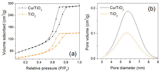 Isotherms and pore size distributions of the synthesized materials are shown in Figure 1. The samples presented unimodal pore diameters with type IV isotherms and type H2 hysteresis cycles (relative pressure values between 0.5 and 0.9), which is characteristic of mesoporous materials forming a structure of interconnected pores [36]. The saturation point adsorption band for the Cu/TiO2 sample is higher compared to that of the TiO2 sample, which corresponds to a higher surface area, as can be seen in Figure 1a.