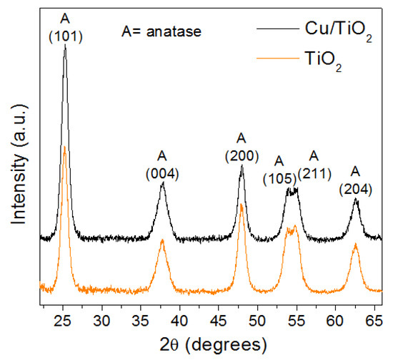 Figure 2 shows the X-ray diffraction patterns of the synthesized catalysts. As can be seen, the materials exhibited only characteristic peaks of the anatase TiO2 crystalline phase corresponding to the planes (101), (004), (200), (105), (211), and (204), which are located at 2θ values of 25.29°, 37.94°, 47.97°, 53.91°, 55.03°, and 62.65°, respectively [37]. Copper species can be present in the Cu/TiO2 catalysts as Cu2+, based on the used synthesis method [38], these species were later confirmed by XPS. These species exhibit ionic radii (0.072 nm) very similar to those of the Ti4+ species (0.068 nm) that are part of TiO2 and they are probably well dispersed within the structure of anatase crystals [39], so that no peak with respect to copper oxides was observed (see Figure 2). On the other hand, a slight shift in the position of the (101) anatase peak towards higher 2θ values is related to the crystal lattice distortion by Cu species, which reduces crystal growth [40]. As can be seen in Table 3, the addition of Cu cations in the titania reduces the average crystalline size from 8.22 nm to 7.98 nm, and an increase in the lattice distortion can be observed. The copper content in the catalyst, determined by atomic absorption spectroscopy, was 3.8 wt.%, as can be seen in Table 3. This value is in good agreement with the theoretical value of 3.9 wt.%. Energy dispersive spectroscopy analysis was also carried out and showed a value of 3.75 wt.% Cu (see Figure S1).