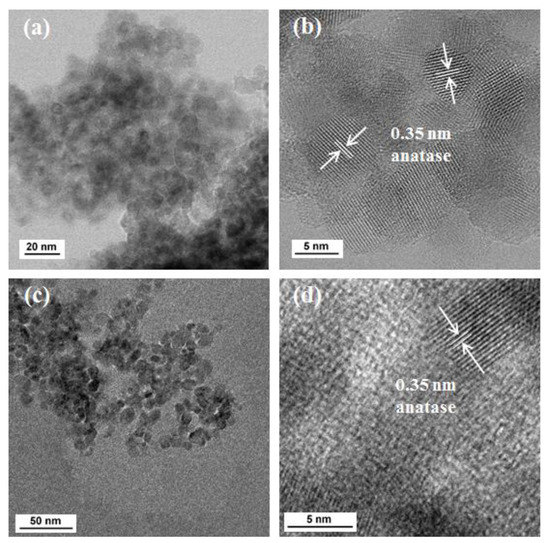 Transmission electron micrographs (TEM) and high-resolution transmission electron micrographs (HRTEM) for the synthesized catalysts are shown in Figure 4. Both materials, Cu/TiO2 and TiO2, exhibit crystalline structures of irregular shapes and sizes between 7 and 10 nm, as can be seen in Figure 4a,c, which is in agreement with the XRD analyses during the estimation of the average anatase crystal size. HRTEM images shown in Figure 4b,d exhibit parallel lines that are related to the distance “d” between two planes (101) of anatase at a value of 0.35 nm [42], which is the preferential growth direction of the crystals. These images confirm the high crystallinity and well-defined structures of the catalysts.