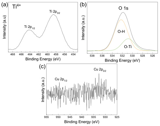 By means of X-ray photoelectron spectroscopy (XPS) analysis, the oxidation state of the species on the surface of the Cu/TiO2 catalyst were established. Figure 6a shows the XPS spectra for Ti 2p with peaks for Ti 2p1/2 and Ti 2p3/2 at 264.2 eV and 258.6 eV, respectively, assigned to Ti4+ [41]. Figure 6b shows the XPS spectra for O 1s with two contributions at 532.2 eV and 530.7 eV, assigned to surface oxygen (O-H) and oxygen into the TiO2 lattice (O-Ti), respectively [45]. Figure 6c shows the XPS spectra for Cu 2p with two peaks at binding energies of 950 eV and 933 eV assigned to the Cu 2p1/2 and Cu 2p3/2 states, respectively, which correspond to Cu2+ species forming Cu-O-Ti bonds [38].