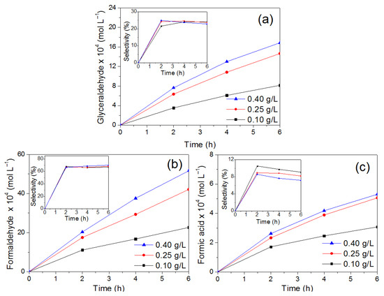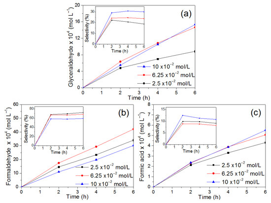 The products formed with an effect on the initial glycerol concentration are shown in Figure 13. In this figure, it is observed that the formation of GCD is favored at high concentrations of glycerol and long reaction times. The maximum formation of GCD and selectivity were obtained of 1.53 mM and 30%, respectively, with a glycerol concentration of 10 × 10−2 mol/L at 6 h of reaction, as shown in Figure 13a. On the other hand, the generation of formaldehyde is not directly related to the increase in glycerol concentration, because its maximum concentration was obtained by using the intermediate initial concentration of 6.25 × 10−2 mol/L, as can be seen in Figure 13b. With respect to formic acid, a considerable effect was not observed with the initial amount of glycerol; however, an increase in selectivity occurs when a high initial concentration of glycerol is used according to Figure 13c. Both FD and FA were identified from low glycerol concentrations as they are secondary reaction products. Formaldehyde is the reaction product that exhibited the highest formation with a concentration of 4.2 mM. Although other products generated during the oxidation of glycerol have been reported by other investigations (glycolic and glyceric acids) as precursor compounds of formaldehyde and formic acid [31,55], in this study, such products were not identified.