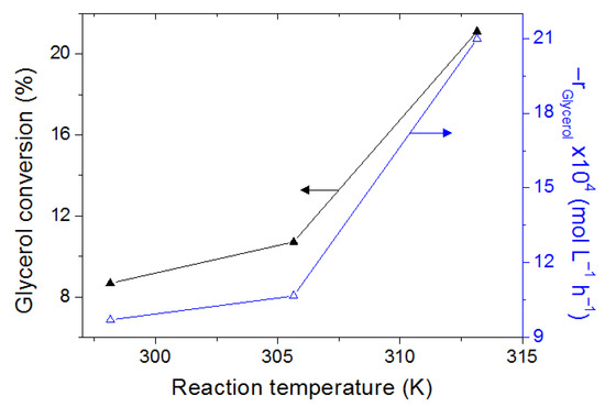 The effect of reaction temperature was studied in the range of 298.15–313.15 K while keeping the concentration of catalyst (0.25 g/L) and glycerol (6.25 × 10−2 M) constant. Figure 10 shows the glycerol conversion and initial reaction rate with different temperatures on the photo-oxidation reactions. As can be seen, the increase in temperature promotes the degradation of glycerol, achieving a conversion of 21% at 313.15 K in 6 h. This is related to a greater molecular excitation that favors the interaction between the glycerol molecules and the catalyst, which increases the catalytic activity [52]. Likewise, initial reaction rates are favored by the increase in temperature. The decrease in glycerol concentration due to evaporation from solution is considered negligible.