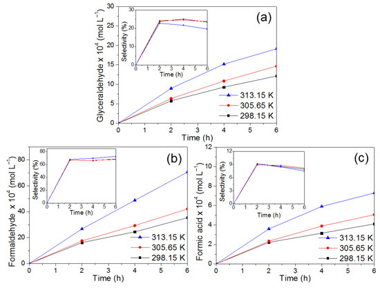 Figure 11 shows the effect of reaction temperature on concentration and selectivity of the products formed during glycerol photo-oxidation. It is worth noticing that the accumulation of GCD is favored by the increase of temperature, see Figure 11a, which is associated with an increase in the oxidation rate of glycerol [53]. These results indicate the reaction, beyond temperatures of 305 K, is being photo- and thermo-activated. The GCD concentration increases 57% as the temperature increases from 298.15 K to 313.15 K after 6 h of reaction due to high oxidation. This is supported by the fact that the production rates of the secondary products (FD and FA), see Figure 11b,c, increase according to temperature. The selectivity of these products remained practically constant with the increase in temperature with values around 69% and 8% for FD and FA, respectively. In the case of GCD, the selectivity decreases with high temperature and this can be ascribed to the presumed increase in its oxidation rate. The maximum concentration of 7.06 mM was obtained for formaldehyde compared to the glyceraldehyde (1.91 mM) and formic acid (0.73 mM) products at 313.15 K.