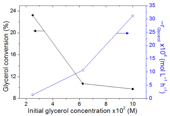 The effect of the initial glycerol concentration on the conversion percentage and initial reaction rate of this organic compound is shown in Figure 12. As can be seen, the reaction rate increases from 1.39 × 10−4 mol/L h to 31.16 × 10−4 mol/L h when the initial glycerol concentration is quadrupled from 0.025 M to 0.10 M, which is related to a high oxidation at the beginning of the reaction due to the presence of a greater amount of organic glycerol molecules. A decrease in the amount of glycerol was also observed for the three tested concentrations due to oxidative processes. Low glycerol concentrations (25 mM) exhibited higher percentages of decrease (23.2%) when compared to high initial concentrations (100 mM) that showed a decrease of 9.7%. This behavior is associated with a saturation effect on the active sites of the catalyst, which reduces the activity [54].