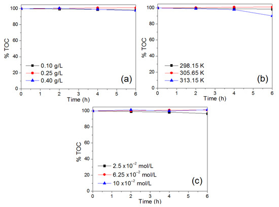 In order to evaluate the degree of mineralization during the glycerol photo-oxidation tests, measurements of the total organic carbon (TOC) content were carried out and the results are shown in Figure 14. As can be seen, the deep oxidation of glycerol towards CO2 and H2O was not achieved with respect to the variables studied. However, when a reaction temperature of 313.15 K is used, the maximum change in the TOC value is achieved with a decrease of 10% after 6 h of reaction, as can be seen in Figure 14b. This phenomenon is related to the high oxidation of the organic molecule, as well as of the intermediate compounds.