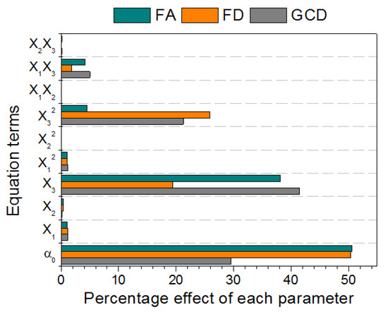 The analysis of variance (ANOVA), as can be seen in Table S1 of the Supplementary Information, suggests a quadratic polynomial model with a square root transform for a better representation of the experimental data according to the value obtained from the coefficient of determination (R2), with values of 0.9908, 0.9949, and 0.9857 for the response variables GCD, FD, and FA, respectively. R2 values close to unity indicate a better fit of the data; otherwise small values indicate that the response values are not adequate to explain the behavior [56]. The values of the determination coefficients obtained in our study are higher than 0.7, therefore the effect of the independent variables on the response values can be appropriately described by the quadratic polynomial model (Fit Statistics can be seen in Table S1).