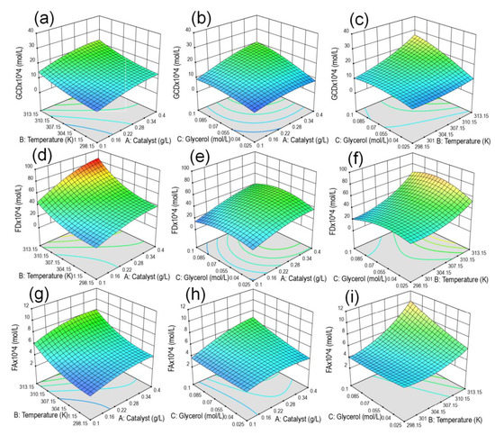 In order to observe the influence of the amount of catalyst, reaction temperature, and glycerol concentration on the response variables (products concentration), 3D plots are shown in Figure 16 by keeping one independent variable constant (at the central value) and varying the other two variables within the studied range. Figure 16a,d,g shows the change in reaction temperature and amount of catalyst with a constant glycerol concentration of 0.0625 mol/L, Figure 16b,e,h presents the variation in glycerol concentration and catalyst amount with a constant reaction temperature of 305.65 K, and Figure 16c,f,i exhibits the change in glycerol concentration and reaction temperature with a constant catalyst amount of 0.25 g/L, which allows to graphically observe the interaction of all the independent variables involved in this study.