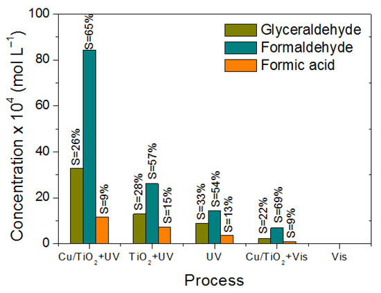 On the other hand, only glyceraldehyde was obtained as a primary oxidation product with a concentration of 2.22 × 10−4 mol/L when using Cu/TiO2 + visible light, and a low concentration of formaldehyde (6.92 × 10−4 mol/L) and formic acid (0.92 × 10−4 mol/L) as secondary products compared to those obtained with Cu/TiO2 + UV radiation (84.29 × 10−4 mol/L and 11.61 × 10−4 mol/L, respectively), according to the scheme proposed in Figure 9. This behavior is related to the low activation of the catalyst, since the visible radiation did not provide enough energy to generate a greater number of electron/hole pairs (see Figure S2), despite the fact that the semiconductor presented a reduction in the band-gap energy (see Table 2), which has been reported in other investigations [38,39,40]. However, the selectivity towards formaldehyde is favored by using visible radiation (69%) instead of UV light (65%), as can be seen in Figure 17. The pH before (5.8) and after (3.6) the process for the Cu/TiO2 + UV system suggests the generation of acid species, in this case the formation of formic acid as a secondary product during the photo-oxidation of glycerol [57].