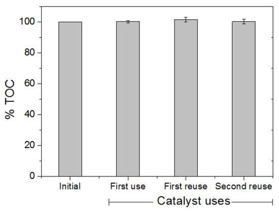The stability of the synthesized Cu/TiO2 catalyst was evaluated under optimal reaction conditions using two catalyst reuse cycles. The TOC content was evaluated after each cycle and the results are shown in Figure 18. As can be seen, there is no change in the TOC value at the end of each cycle, which is related to the partial oxidation of glycerol without reaching a deep level of oxidation in terms of mineralization in each reuse. This is a relevant result since mineralization is a main cause of selectivity loss reported in other works [58]. Although H2 has been identified and quantified as a product from the photocatalytic oxidation of glycerol [21,27], in this study, the investigation was centered only on the generated organic products.