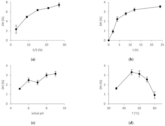 Main effect plots of OFAT experiments on (a) DH vs. E/S ratio, (b) DH vs. incubation time, (c) DH vs. initial pH, and (d) DH vs. hydrolysis temperature. Data are expressed as mean ± standard deviation of triplicate determinations.