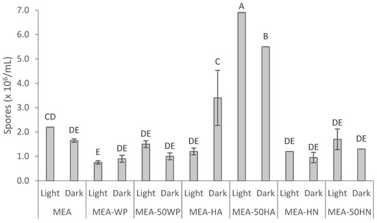 Effect of medium composition and presence or absence of visible light on sporulation of F. striatum. MEA: malt extract agar medium; MEA-WP: malt extract agar medium without peptone; MEA-50WP: malt extract agar medium without peptone and 50% of malt extract; MEA-HA: malt extract agar medium containing Alcalase 2.4 L hydrolysate; MEA-50HA: malt extract agar medium with 50% of malt extract replaced by Alcalase 2.4 L hydrolysate; MEA-HN: malt extract agar medium containing Neutrase 0.8 L hydrolysate; and MEA-50HN: malt extract agar medium with 50% of malt extract replaced by Neutrase 0.8 L hydrolysate. Different letters indicate significant differences among culture media (p < 0.05).