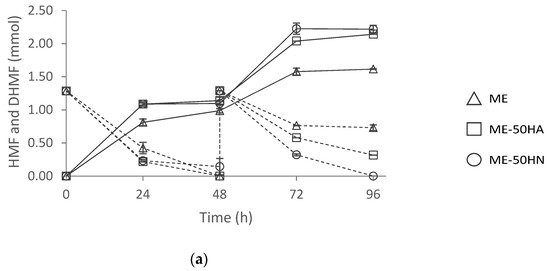 HMF reduction to DHMF with (a) discs and (b) spores of F. Striatum. ME: malt extract medium, ME-50HA: malt extract medium with 50% of malt extract replaced by Alcalase 2.4 L hydrolysate, and ME-50HN: malt extract medium with 50% of malt extract replaced by Neutrase 0.8 L hydrolysate.