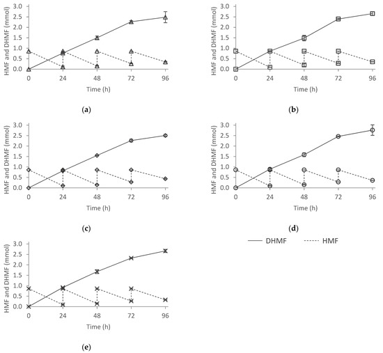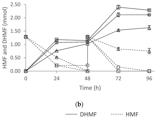 Within 72 h of the reaction, F. striatum reduced HMF to DHMF at a constant rate, achieving around 2.5 mmol of DHMF in the reaction media (Figure 7). After the fourth HMF addition, although HMF conversion rate was not reduced (90% of the HMF added was consumed), the DHMF production was slowed down, observing that only 30% was biotransformed to DHMF. HMF could have been used as carbon source or biotransformed to other non-detectable products with the methodology employed. These observations might be related to the F. striatum cells tolerance towards DHMF.